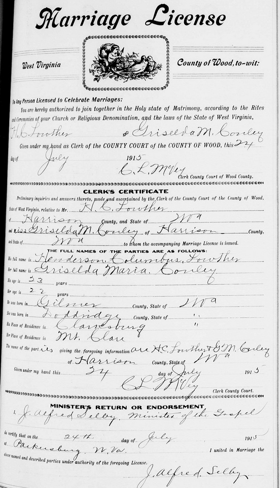 Jul-28-2018Husband: Henderson Columbus Lowther Born: Feb-12-1892 in Gilmer Co, WV 1,2 (see note 1) Died: Oct-25-1958 3,1 Resided: 1954 in Salem, WV 4 Census: 1940 in Sawyers Run (Salem), Harrison Co, WV Resided: 1935 in Sawyers Run (Salem), Harrison Co, WV 5 Census: 1930 in Davisson Run (Clarksburg), Harrison Co, WV Census: 1920 in Clarksburg, Harrison Co, WV Resided: 1915 in Clarksburg, Harrison Co, WV 2 Census: 1910 in Troy District, Gilmer Co, WV Occupation: 1940 fire insurance agent 5 Occupation: 1930 fire insurance adjuster 6 Occupation: 1920 newsstand worker 7 Father: James Samson Lowther (1851 - 1933) Mother: Margaret F. Holliday (1854 - 1912) Other spouse 1 Other spouse 2 Notes