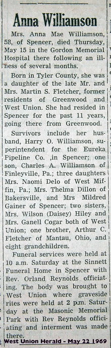 Wife: Anna Mae Fletcher 5,6 Also known as: Annie 7 Married: Feb- 8-1930 in Doddridge Co, WV 8 Born: 1911 in Tyler Co, WV 2,3 Died: May-15-1969 in Spencer, Roane Co, WV 2 Buried: in Masonic Memorial Park Cemetery, Crystal Lake (West Union), WV 2,3 Resided: 1958-69 in Spencer, Roane Co, WV 2 Resided: bef 1958 in Greenwood, Doddridge Co, WV 2 Census: 1930 in Greenwood, Doddridge Co, WV Census: 1920 in Centerville District, Tyler Co, WV Father: Silas Martin Fletcher (1888 - 1951) Mother: Della May Wells (1888 - 1949)