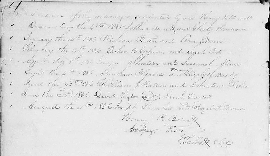 Wife: Amy "Ora" Means Married: Jan-14-1836 in Lewis Co, (W)VA 2 Born: 1816 1 Died: bef 1845 1 Father: Robert Means (1762 - 1835) Mother: Margaret "Mary" Henry (1770 - 1850)
