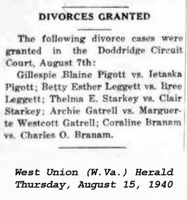 Sources: (1) 1920 Census, Doddridge County, WV (Southwest District). (2) Doddridge County Birth Records, West Union, WV, BR Bk 4, p. 100. (3) Social Security Death Index. (4) Obituary. (5) Wood County Marriage Records, Parkersburg, WV. (6) Obituary of father. (7) Obituary of brother. (8) Birth record of son. (9) Doris Kimball "Dee" Puffer, Descendants of Isaac Leggett. (10) West Union Herald, 8/15/1940. (11) Findagrave.com. (12) Social Security Death Index, Social Security card issued in Virginia before 1951. (13) Virginia Marriage Records, 1936-2014, Ancestry.com. (14) 1930 Census, Doddridge County, WV (West Union District). (15) 1930 Census, Doddridge County, WV (Grant District). Event Notes Note (1) SSDI shows birth date as Aug 14 1918, but other sources report Aug 19 1918. Name Index