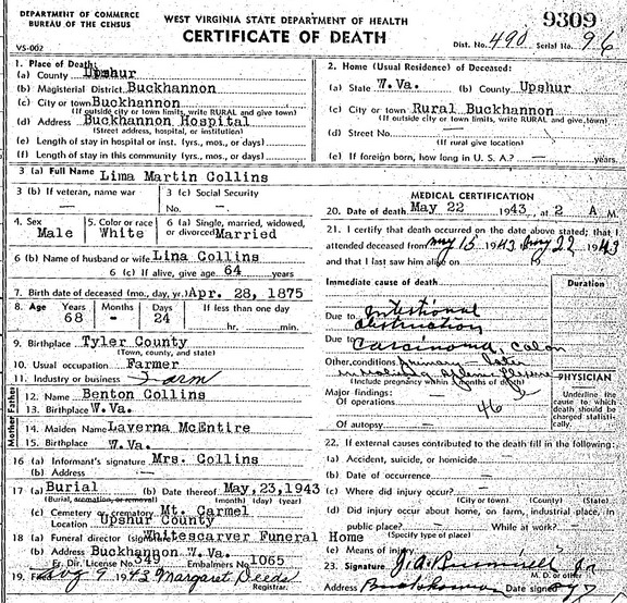 Jul-28-2018Husband: Larmar Martin Collins Born: Apr-28-1875 in Tyler Co, WV 1,2 Died: May-22-1943 in Buckhannon, Upshur Co, WV 3 Buried: in Mt. Carmel Cemetery, Tallmansville, Upshur Co, WV 1 Resided: near Buckhannon, Upshur Co, WV 1 Census: 1900 in Southwest District, Doddridge Co, WV (see note 1) Census: 1880 in Centerville District, Tyler Co, WV Occupation: farmer 1 Father: Henry Benton Collins (1845 - 1913) Mother: Emily Laverna McIntyre (1851 - 1919)