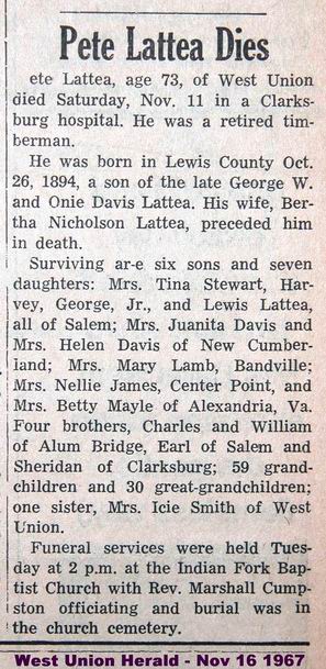 Jul-28-2018Husband: Pete Lattea 1,2 Census name: Peter Lattea 3,4 Born: Oct-26-1894 in Fink, Lewis Co, WV 1,5 Died: Nov-11-1967 in Clarksburg, Harrison Co, WV 6 Buried: in Indian Fork Baptist Cemetery, New Milton (Coldwater), Doddridge Co WV 1 Resided: in West Union, Doddridge Co, WV 1 Census: 1920, 1930 in New Milton, Doddridge Co, WV 4 (see note 1) Census: 1910 in Greenbrier District, Doddridge Co, WV Occupation: timberman 1 Father: George W. Lattea (1869 - 1955) Mother: Winona "Ona" Davis (1870 - 1950)