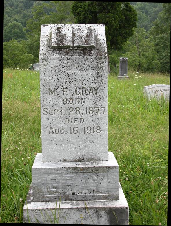 Jul-28-2018Husband: Marshall Franklin Gray Born: Sep-28-1877 in Oxford, Doddridge Co, WV 1,2,3 Died: Aug-16-1918 in Oxford, Doddridge Co, WV 4,3,5,6 Buried: in Oxford Baptist Church Cemetery, Doddridge Co, WV 3,7 Cause of death: White Plague (tuberculosis) 7 Census: 1880, 1900 in Southwest District, Doddridge Co, WV Occupation: 1900 rig builder 8 Father: John M. Gray (1842 - 1914) Mother: Dora M. Bode (1857 - 1894) Other spouse 2