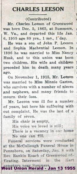 Jul-28-2018Husband: Charles L. Leeson Born: Dec- 5-1865 in Summers, Doddridge Co, WV 1,2 Died: Jan- 6-1955 in Greenwood, Doddridge Co, WV 3,4 Buried: in Hart Cemetery, Taylor Drain Rd, Oxford, Doddridge Co WV 5,1 Resided: in Greenwood, Doddridge Co, WV 1,6,7 Census: 1870, 80, 1900, 20 in Southwest District, Doddridge Co, WV Father: John P. Leeson (1829 - 1875) Mother: Sophia McIntyre (1844 - 1920) Other spouse 1 Notes