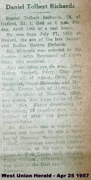 Jul-28-2018Husband: Daniel Tolbert Richards Born: Jul-17-1878 in Oxford, Doddridge Co, WV 1,2 Died: Apr-19-1957 in Doddridge Co, WV 3,4,5 Buried: in Hart Cemetery, Taylor Drain Rd, Oxford, Doddridge Co WV 6,1,7 Resided: in Oxford, Doddridge Co, WV 1,7 Census: 1920 - Bonds Creek in Clay District, Ritchie Co, WV Census: 1880, 1900, 1910 in Southwest District, Doddridge Co, WV Occupation: carpenter & farmer 1,7 Father: Samuel Richards (1838 - 1909) Mother: Rulina A. Gaston (1851 - 1905)