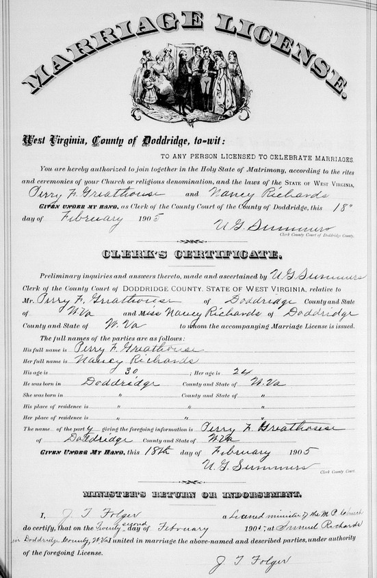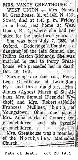 Sources: (1) Obituary. (2) Obituary - Nursing home. (3) Obituary of wife. (4) Doddridge County WV Deaths 1853-1969, Wes Cochran, 156 Gihon Meadows, Apt 150, Parkersburg, WV 26101. (5) Obituary of husband. (6) Doddridge County Marriage Records, West Union, WV, Identified as Perry F. Greathouse, 30, b. & res. in Doddridge Co; and Nancy Richards, 24, b. & res. in Doddridge Co. Married Feb 22 1905 "at Samuel Richards in Doddridge County, W. Va." (Note: Obituaries of both husband and wife incorrectly state marriage date as 1901.), MR p. 242. (7) Doddridge County Death Records, West Union, WV, DR Bk 5, p. 70-E. (8) Cemeteries of Clark District, Harrison County, WV, Harrison County Genealogical Society, Clarksburg, WV. (9) Obituary of brother. (10) Social Security Death Index. (11) Harrison County Marriage Records, Clarksburg, WV. (12) 1910 Census, Doddridge County, WV (New Milton District) (13) Obituary of father. (14) Obituary of mother. (15) Harrison County Marriage Records, Clarksburg, WV, Identified as Samuel Matthew Wyckoff, 21, b. Harrison Co, res. Clarksburg, son of E. D. & Laura K.; and Frankie Luzada Greathouse, 18, b. & res. in Harrison Co, dau of P. F. & Nancy. Married Sep 20 1923 in Clarksburg. MR p. 324. (16) Social Security Death Index, Social Security card issued in Ohio before 1951. (17) Findagrave.com. (18) Social Security Death Index, Social Security card issued in West Virginia before 1951. (19) Death Record - Online. (20) Harrison County Birth Records, Clarksburg, WV, Identified as Perry L. Greathouse, white male, b. Jun 26 1921 in Clarksburg, son of Perry F. Greathouse & Nancy M. Richards. BR p. 77.Name Index