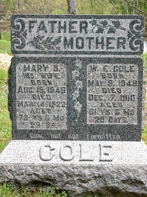 Jul-28-2018Husband: William Franklin Cole 1 Also known as: Franklin W. Cole 2 Born: May- 9-1849 in Barbour Co, (W)VA 3,4 Died: Dec- 7-1910 in Doddridge Co, WV 5,3 Buried: in Point Pleasant Baptist Church Cemetery, Fallen Timber, Doddridge Co, WV 3 Census: 1870, 1880 in Southwest District, Doddridge Co, WV Occupation: farmer 6 Father: William Cole (1814 - 1892) Mother: Elizabeth Bartlett (1815 - 1883)