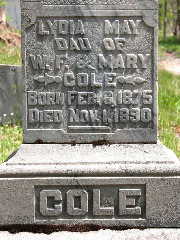 F Child 4: Lydia May Cole Census name: Liddie M. Cole Born: Feb- 6-1875 3 Died: Nov- 1-1890 3 Buried: in Point Pleasant Baptist Church Cemetery, Fallen Timber, Doddridge Co, WV 3 Census: 1880 in Southwest District, Doddridge Co, WV