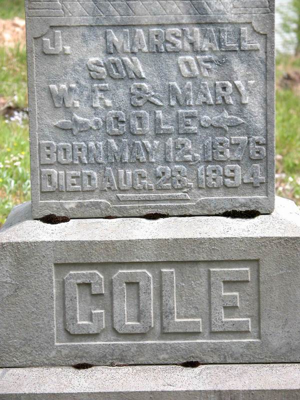 M Child 5: James Marshall Cole Also known as: J. Marshall Cole 3 Born: May-12-1876 3 Died: Aug-28-1894 3 Buried: in Point Pleasant Baptist Church Cemetery, Fallen Timber, Doddridge Co, WV 3 Census: 1880 in Southwest District, Doddridge Co, WV