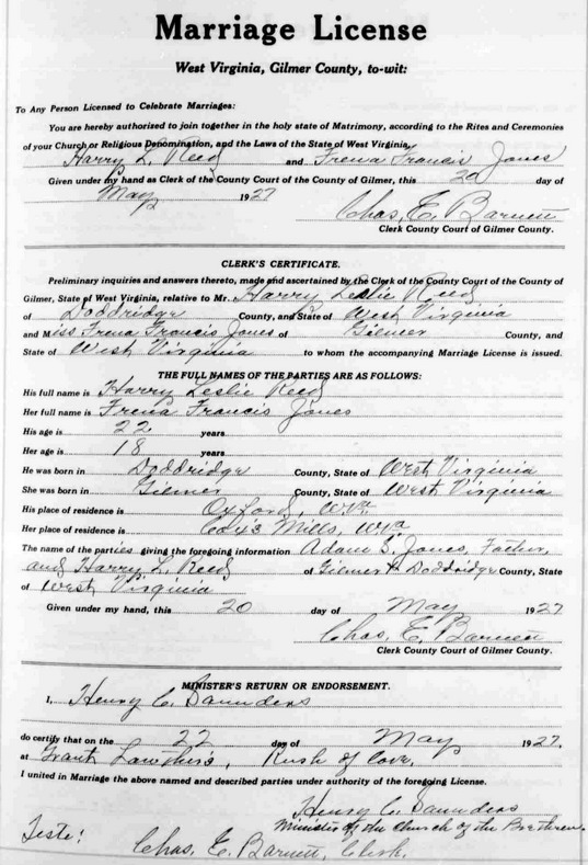 Wife: Frena Francis Jones Census name: Frances Jones 6 Married: May-22-1927 in Gilmer Co, WV 7