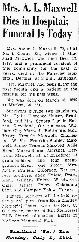 Born: Nov-23-1860 1,2,3 Died: Dec-13-1913 at Lick Run, New Milton (Blandville), Doddridge Co, WV 4 Buried: in Maxwell Farm, Hughes River Rd, near Porto Rico, Doddridge Co, WV 1 Cause of death: pneumonia 5 Census: 1870 80, 1900, 10 in New Milton District, Doddridge Co, WV Occupation: farmer 5,6 Father: Williams Maxwell (1821 - 1897) Mother: Lydia Vannort (1835 - 1888)Wife: Cornelia Anna "Annie" Enlow 7 Also known as: Anna Enlow 7 Married: Jul- 7-1889 in Doddridge Co, WV 8 Born: Mar-13-1872 in Market, Doddridge Co, WV 9,10,2 (see note 1) Died: Jun-30-1951 in Degolia, McKean Co, PA 9,11 Buried: in McKean Memorial Park, Bradford, McKean Co, PA 9,1 Resided: in Bradford, McKean Co, PA 9 Census: 1930 at Toms Fork, Porto Rico, Doddridge Co, WV 12 Census: 1900, 1910, 1920 in New Milton District, Doddridge Co, WV Census: 1880 in Southwest District, Doddridge Co, WV Father: Henry J. Enlow (1845 - 1913) Mother: Senora Dallas Stout (1846 - 1915) Notes