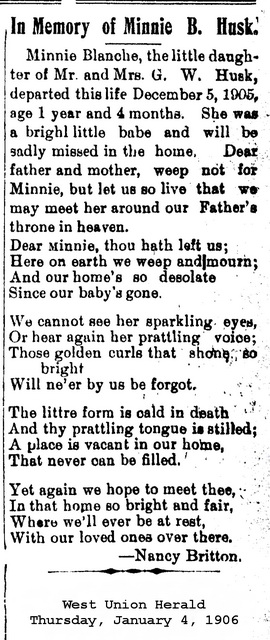 F Child 5: Bessie Lee Husk Born: Dec- 3-1901 in Doddridge Co, WV 9,14,15 Died: Feb-26-1977 in Parkersburg, Wood Co, WV 9,14,15 Buried: in Cairo Masonic Cemetery, Ritchie Co, WV 15 Resided: in Cairo, Ritchie Co, WV 9 Census: 1930 in Murphy District, Ritchie Co, WV Husband: Roscoe Wright b. Nov- 8-1891 d. Jul-22-1959 Census name: Rosco Wright 16,17 Married: Jul-5-1920F Child 6: Minnie Blanche Husk Born: Aug- 5-1904 in Doddridge Co, WV 2 Died: Dec- 5-1905 2,9 Buried: in Hart Cemetery, Taylor Drain Rd, Oxford, Doddridge Co WV 2