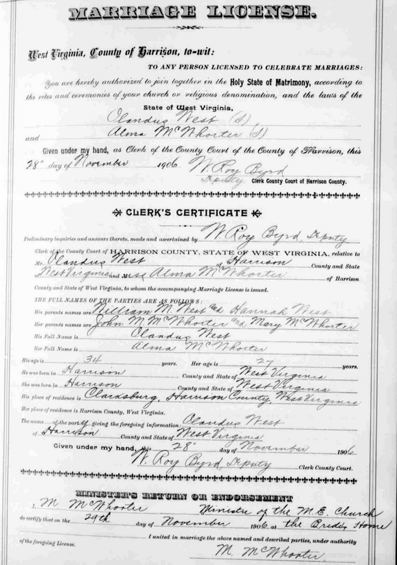 Sources: (1) William F. Donnelly, The Wests of Duck Creek, Harrison County, Virginia (now West Virginia), Gateway Press, Baltimore MD, 1997, p. 417. (2) Harrison County Marriage Records, Clarksburg, WV, Identified as Olandus West, 34, b. Harrison Co, res. Clarksburg, son of William M. & Hannah West; and Alma McWhorter, 27, b. & res. in Harrison Co, dau of John M. & Mary McWhorter. Married Nov 29 1906 "at the Brides's Home." (Note: Other researchers, e.g. William F. Donnelly citing Minnie McWhorter, incorrectly report marriage date one day earlier, on Nov 28 1906.), MR p. 148. (3) William F. Donnelly, The Wests of Duck Creek, Harrison County, Virginia (now West Virginia), Gateway Press, Baltimore MD, 1997, p. 210. (4) WV State Dept of Health, Div of Vital Statistics, Death Certificate (http://www.wvculture.org/vrr/va_dcsearch.aspx) (5) Harrison County WV Marriages 1895-1912, Wes Cochran, 2515 10th Ave, Parkersburg, WV 26101 (Feb 2001) (6) Cemeteries of Clark District, Harrison County, WV, Harrison County Genealogical Society, Clarksburg, WV.Name Index