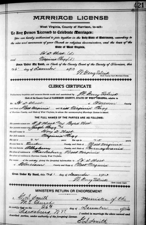 Wife: Virginia Clegg Married: Dec-26-1913 in Harrison Co, WV 2 No children: 2 Born: ca 1888 in Allegheny Co, PA 3 Resided: 1913 in Harrison Co, WV 3 Father: Joseph Clegg
