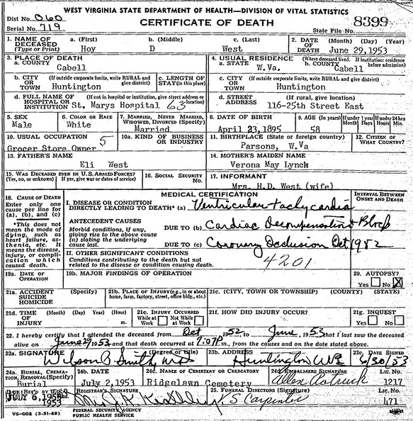 Jul-28-2018Husband: Hoy D. West Born: Apr-23-1895 in Parsons, Tucker Co, WV 1 (see note 1) Died: Jun-29-1953 in Huntington, Cabell Co, WV 1 Buried: in Ridgelawn Memorial Park, Barboursville, Cabell Co, WV 1 Resided: in Huntington, Cabell Co, WV 1 Resided: 1950 in Marathon, Monroe Co, FL 2 Resided: 1913 in Clarksburg, Harrison Co, WV 3 Occupation: grocer, carpenter 2,1 Father: Eli Jacob West (1860 - 1939) Mother: Verona May Lynch (1863 - 1939) Other spouse 2 Notes 2