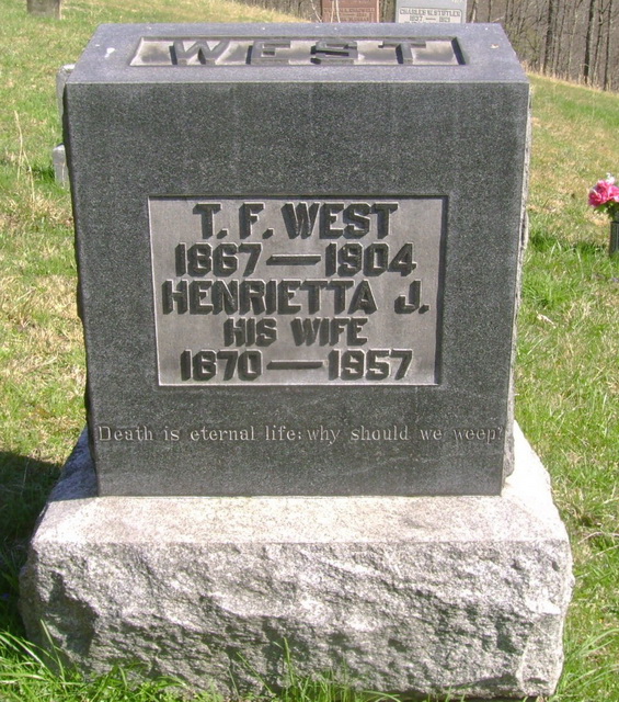 Jul-28-2018Husband: Thomas Floyd West Also known as: T. F. West 1 Born: Aug-22-1867 in Harrison Co, WV 2,3,4 Died: Aug-20-1904 in Big Isaac, Doddridge Co, WV 4,5,3 Buried: in Big Isaac Cemetery, Big Isaac, Doddridge Co, WV 6,7 Census: 1900 in Greenbrier District, Doddridge Co, WV Occupation: carpenter, cobbler, constable, and ran a planing mill 6 Father: John Jackson West (1837 - 1906) Mother: Mary Elizabeth Cozad (1840 - 1922)