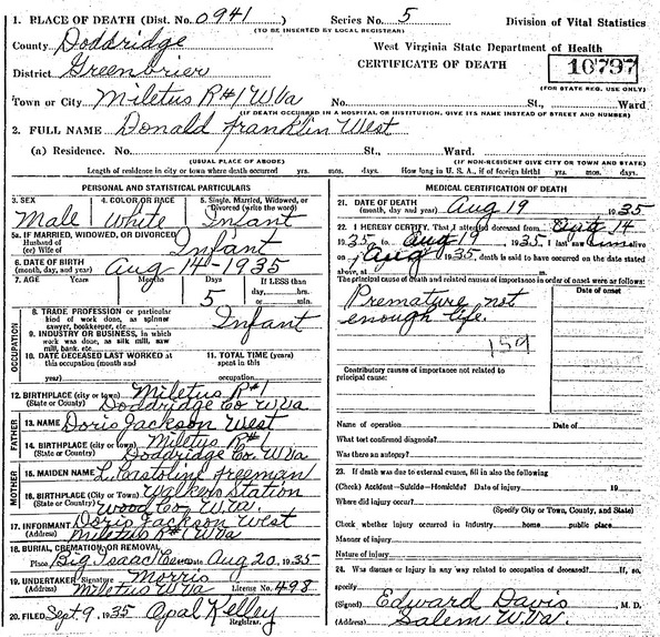 Sources: (1) 1930 Census, Doddridge County, WV (Greenbrier District). (2) William F. Donnelly, The Wests of Duck Creek, Harrison County, Virginia (now West Virginia), Gateway Press, Baltimore MD, 1997, p. 430. (3) Death record of son. (4) Obituary of father. (5) 1940 Census, Doddridge County, WV (Greenbrier District) (6) Obituary of brother. (7) WV State Dept of Health, Div of Vital Statistics, Death Certificate (http://www.wvculture.org/vrr/va_dcsearch.aspx). Identified as Donald Franklin West, age 5 day, b. Aug 14 1935 at Miletus, d. Aug 19 1935 at Miletus due to premature birth. Burial at Big Isaac Cemetery. (Note: "The Wests of Duck Creek," p. 430, reports birth-death dates as Aug 21 - Aug 26 1935.) (8) Doddridge County WV Deaths 1853-1969, Wes Cochran, 156 Gihon Meadows, Apt 150, Parkersburg, WV 26101. (9) WV State Dept of Health, Div of Vital Statistics, Death Certificate (http://www.wvculture.org/vrr/va_dcsearch.aspx) (10) William F. Donnelly, The Wests of Duck Creek, Harrison County, Virginia (now West Virginia), Gateway Press, Baltimore MD, 1997, p. 434. (11) Cemetery marker.Name Index