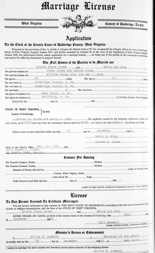 Sources: (1) Obituary. (2) National Cemetery Administration. Nationwide Gravesite Locator, U.S. Veterans Gravesites (www.ancestry.com) (3) Findagrave.com. (4) Obituary of sister. (5) Obituary of brother. (6) Obituary of grandson. (7) Doddridge County Marriage Records, West Union, WV. (8) Obituary of father. (9) Obituary of mother. (10) U.S. World War II Army Enlistment Records, 1938-1946, Ancestry.com and National Archives & Records Administration. (11) U.S. Department of Veterans Affairs BIRLS Death File, 1850-2010 [database on-line], Ancestry.com. (12) Newspaper birth announcement. (13) Doddridge County Marriage Records, West Union, WV, Identified as Grover Frank Jones, 28, b. Doddridge Co, res. West Union, son of Creed & Lenora Jones; and Betty Lou Gray, 21, b. Doddridge Co, res. Smithburg, dau of William Henry & Ada B. Gray. Married Dec 23 1952 in West Union. MR p. 452. (14) Social Security Death Index. (15) Obituary of husband.Name Index