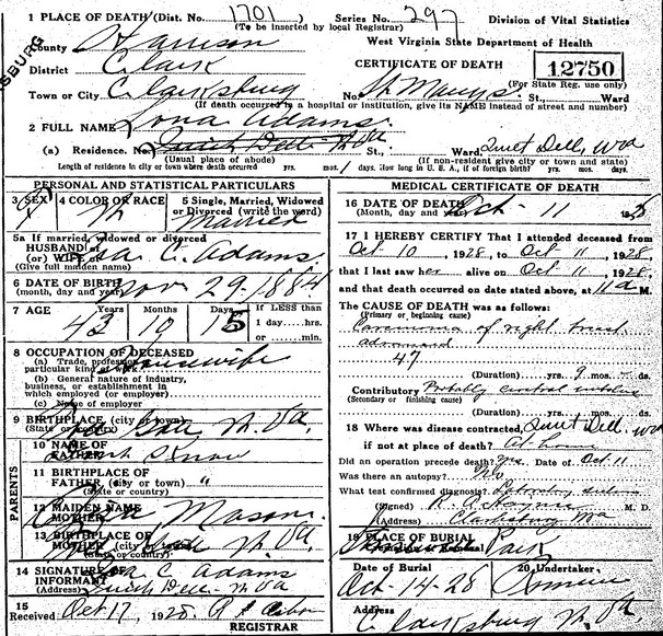 Sources: (1) WV State Dept of Health, Div of Vital Statistics, Death Certificate (http://www.wvculture.org/vrr/va_dcsearch.aspx) (2) Obituary - Hospital. (3) Obituary. (4) Obituary of mother. (5) Obituary of sister. (6) Doddridge County WV Marriages 1845-1937, Wes Cochran, 156 Gihon Meadows, Apt 150, Parkersburg, WV 26101 (Jan 1993), Identified as Ira Adams, 18, of Doddridge Co; and Lona Mason, 21, of Doddridge Co. Married Apr 28 1906. (7) Doddridge County WV Marriages 1845-1937, Wes Cochran, 156 Gihon Meadows, Apt 150, Parkersburg, WV 26101 (Jan 1993) (8) 1920 Census, Harrison County, WV. (9) Harrison County Marriage Records, Clarksburg, WV. (10) Social Security Death Index. (11) Headstone. (12) Findagrave.com. (13) Obituary of father. (14) Headstone (year only) (15) Nicholas County Marriage Records, Summersville, WV. (16) Social Security Death Index, Social Security card issued in West Virginia before 1951. (17) Death Record - Online, Ohio, Vol 19921, Certificate No. 098724.Name Index
