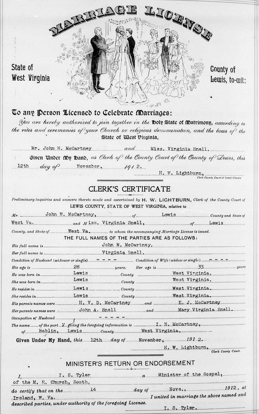 Sources: (1) Doddridge County Marriage Records, West Union, WV, MR Bk 17, p. 372. (2) Doddridge County Death Records, West Union, WV. (3) Doddridge County Death Records, West Union, WV, Identified as John Newton McCartney, 80, b. Mar 1 1884 in West Virginia, parents "unknown," married, farmer, died Dec 13 1964 at Rt. 1, West Union, cause of death coronary thrombosis, buried at Ruley Cemetery. Informant: Sylvia McCartney, Rt. 1, West Union. DR p. 122-G. (4) Upshur County Marriage Records, Buckhannon, WV. (5) Lewis County Marriage Records, Weston, WV, Identified as John N. McCartney, 28, b. & res. in Lewis Co, son of H. V. D. & E. J. McCartney; and Miss Virginia Snell, 33, b. & res. in Lewis Co, dau of John A. & Mary Virginia Snell. Married Nov 14 1912 at Ireland WV. MR p. 268. Event Notes Note (1) Age 33 at time of Nov 1912 marriage would put birth in about 1879, but age 42 at time of 1930 Census would put it in about 1888.Name Index