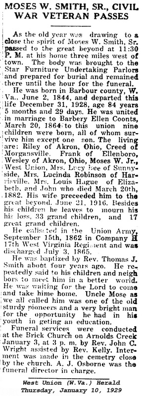 Sources: (1) WV State Dept of Health, Div of Vital Statistics, Death Certificate (http://www.wvculture.org/vrr/va_dcsearch.aspx) (2) 1900 Census, Doddridge County, WV (West Union District) (3) Doddridge County WV Marriages 1845-1937, Wes Cochran, 156 Gihon Meadows, Apt 150, Parkersburg, WV 26101 (Jan 1993) (4) Doddridge County Death Records, West Union, WV, Identified as Moses W. Smith, widowed, farmer, born July 2 1844 in Barbour Co, father (not given), mother Mary Smith (born in Barbour Co); died Jan 1 1929 in West Union District, age 84y 5m 29d, cause of death blood poisoning, burial at Arnolds Creek Cemetery on Jan 3 1929. Informant: Creed Smith. (Note: An entry had been made in the space for father's name, but had then been lined out. Although greatly obscured, the visible portion could be interpreted to read Irving Smith. Burial location has been verified by his headston as being at Ruley Cemetery at Arnolds Creek, not at the Doddridge County cemetery known as Arnolds Creek Cemetery.), DR p. 188 : www.wvculture.org/vrr/va_view.aspx?Id=5049497&Type=Death. (5) Donald Edward Ramage, Doddridge County Cemeteries, Vol. III, 4117 Almaville Rd, Smyna TN 37167 (1988, rev. 1999) (6) U.S. Civil War Soldiers, 1861-1865 [database online], National Park Service , Ancestry.com. (7) 1890 Veterans Schedules [database online], Ancestry.com and National Archives & Records Administration. (8) Obituary of son. (9) Death record of daughter. (10) 1860 Census, Barbour County, (W)VA. (11) Barbour County Marriage Records, Philippi, WV, Identified as Moses W. Smith, 20, born in Barbour Co, residence with United States Army, occupation soldier, parents (blank); and Barbara Elin Koonts, 18, b. & res. in Barbour Co, parents William & Lucinda. Married March 20 1864 in Barbour County. MR p. 18 : www.wvculture.org/vrr/va_view.aspx?Id=11624574&Type=Marriage. (12) Obituary. (13) Headstone (year only) (14) Doddridge County WV Deaths 1853-1969, Wes Cochran, 156 Gihon Meadows, Apt 150, Parkersburg, WV 26101. (15) Death Record - Birth date calculated from age at death. (16) Obituary of father. (17) Headstone. (18) 1870 Census, Barbour County, WV. (19) Findagrave.com. (20) Obituary of brother. (21) 1880 Census, Doddridge County, WV (Central District) (22) Doddridge County Marriage Records, West Union, WV. (23) Obituary - Nursing home. (24) Death record of father. (25) West Virginia Marriage Records, 1863-1900 (http://www.ancestry.com/search/rectype/inddbs/4484.htm) (26) National Archives and Records Administration, World War I Draft Registration Cards, 1917-1918 (Ancestry.com online database) (27) Ritchie County Marriage Records, Harrisville, WV. (28) Social Security Death Index. (29) Obituary of niece. (30) 1910 Census, Doddridge County, WV (West Union District). (31) 1920 Census, Doddridge County, WV (West Union District). (32) 1930 Census, Doddridge County, WV (West Union District). (33) Obituary of wife. (34) Susie Davis Nicholson, Davis - The Settlers of Salem, West Virginia, Gordon Printing Co, Strasburg OH, 1979 (Revised & Enlarged) < www.wvgenweb.org/harrison/books.htm >, p. 325. Event Notes Note (1) In 1910, a member of Moses & Barbara's household was granddaughter Rhoda B. Smith, age 10. In 1920, Moses was living alone (next to son Creed), marital status widowed. Moses was not found in the 1850 or 1860 Census. Note (2) Participated in the following battles: New Creek, Greenland Gap, Droop Mountain, and Lynchburg Raid. He was discharged on July 3, 1865 at Richmond, Virginia. A military grave marker indicates that he was a prisoner of war at Andersonville Prison. Note (3) Birth date given as Dec 1846 in 1900 Census, and 1846 on headstone. But age 2 in 1850 Census and 12 in 1860 Census would put it in about 1848. Age 69y 5m 24d in obituary calculates to a birth date of Dec-28-1846. Note (4) Death date given in father's obituary as March 20 1882, but date on headstone is January 3 1885. No death record found. Note (5) In 1910, on Arnolds Creek Road.