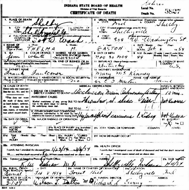 Born: Oct-14-1897 in Weston, Lewis Co, WV 1,2 Died: Mar- 5-1961 in Indianapolis, Marion Co, IN 3 Buried: in Forest Hill Cemetery, Shelbyville, Shelby Co, IN 3,4 Cause of death: Hodgkin's disease 3 Resided: in Shelbyville, Shelby Co, IN 3,5,6 Census: 1930, 1940 in Shelbyville, Shelby Co, IN Census: 1900, 1910, 1920 in Freemans Creek District, Lewis Co, WV (see note 1) Occupation: dentist 7,8,3 Father: Edwin Gaston (1862 - 1940) Mother: Laura Lillian Lovett (1866 - 1939)Wife: Thelma Missouri Faulconer Census name: Missouri T. Faulconer Born: Nov-30-1904 in Kentucky 4,9 Died: Feb- 6-1954 in Shelbyville, Shelby Co, IN 3,4,9 Buried: in Forest Hill Cemetery, Shelbyville, Shelby Co, IN 3,4 Resided: in Shelbyville, Shelby Co, IN 3 Census: 1920, 1940 in Shelbyville, Shelby Co, IN Census: 1910 in Scott Co, KY Occupation: 1940 home management supervisor (farm security) 8 Father: Frank B. Faulconer (1868 - 1931) Mother: Mary McKinney (1878 - )