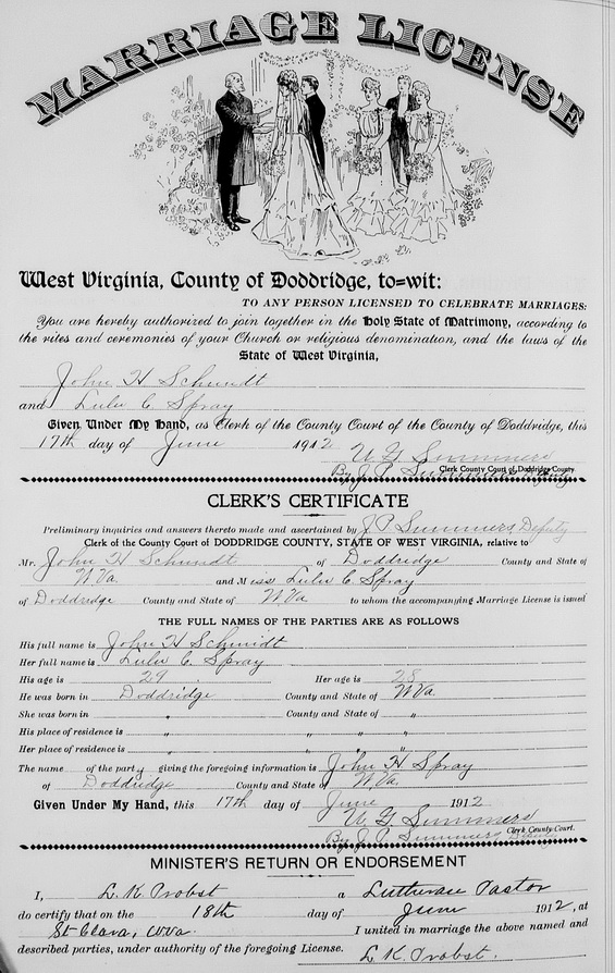 Sources: (1) 1900 Census, Doddridge County, WV (Cove District) (2) WV State Dept of Health, Div of Vital Statistics, Death Certificate (http://www.wvculture.org/vrr/va_dcsearch.aspx) (3) Doddridge County WV Marriages 1845-1937, Wes Cochran, 156 Gihon Meadows, Apt 150, Parkersburg, WV 26101 (Jan 1993) (4) Obituary of wife. (5) Death record of husband. (6) Obituary of wife's mother. (7) Obituary of daughter. (8) Doddridge County Marriage Records, West Union, WV, Identified as John H. Schmidt, 29, b. & res. in Doddridge Co; and Lulu C. Spray, 28, b. & res. in Doddridge Co. Married Jun 18 1912 at St. Clara. (Note: Wife's obituary incorrectly states marriage date as Jun 12 1912.), MR p. 68 : http://www.wvculture.org/vrr/va_view.aspx?Id=11794517&Type=Marriage. (9) Obituary. (10) Social Security Death Index. (11) Headstone. (12) Obituary - Hospital. (13) Donald Edward Ramage, Doddridge County Cemeteries, Vol. III, 4117 Almaville Rd, Smyna TN 37167 (1988, rev. 1999) (14) Obituary of mother. (15) Lewis County Marriage Records, Weston, WV. (16) Social Security Death Index, Social Security card issued in West Virginia before 1951. (17) U.S. World War II Army Enlistment Records, 1938-1946, Ancestry.com and National Archives & Records Administration. (18) U.S. Department of Veterans Affairs BIRLS Death File, 1850-2010 [database on-line], Ancestry.com. (19) Wood County Marriage Records, Parkersburg, WV. (20) Obituary - Nursing home. (21) Obituary of sister. (22) Doddridge County Marriage Records, West Union, WV. Event Notes Note (1) Birth date given as Jul 1883 in 1900 Census, but death record states Jul 29 1882. Note (2) Death date given in wife's obituary as Mar 4 1948, but death record shows it as Mar 5 1948. Note (3) Birth date given in 1900 Census as Dec 1884, but SSDI and obituary state Dec 7 1883.Name Index