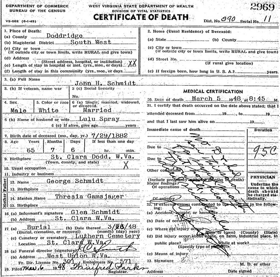 Jul-28-2018Husband: John H. Schmidt Census name: John H. Smith 1 Born: Jul-29-1882 in St. Clara, Doddridge Co, WV 2,3 (see note 1) Died: Mar- 5-1948 in Southwest District, Doddridge Co, WV 2 (see note 2) Buried: in St. Johannes Lutheran Church Cemetery, St. Clara, Doddridge Co, WV 2 Census: 1900 in Cove District, Doddridge Co, WV Occupation: funeral director 4 Father: George Schmidt (1848 - 1903) Mother: Teresa Gamsjager (1858 - 1926)