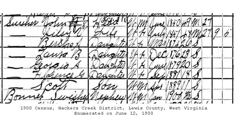 Sources: (1) Findagrave.com. (2) 1900 Census, Lewis County, WV. (3) Betty Mayfield (compiler) & Matha Byrd (editor), Obituaries, Marriage & Births from Weston Independent and/or Weston Democrat, 1939-1940 (Hackers Creek Pioneer Descendants, Jane Lew, WV, April 1996), p. 48. (4) Obituary of wife. (5) Lewis County WV Marriages 1817-1880, Wes Cochran, 2515 10th Ave, Parkersburg, WV 26101. (6) Lewis County WV Marriages 1817-1880, Wes Cochran, 2515 10th Ave, Parkersburg, WV 26101, Identified as John B. Swisher and Allie B. Lawson. Married Jun 22 1872. (7) Betty Mayfield (compiler) & Matha Byrd (editor), Obituaries, Marriage & Births from Weston Independent and/or Weston Democrat, 1939-1940 (Hackers Creek Pioneer Descendants, Jane Lew, WV, April 1996), p. 49. (8) Lewis County Marriage Records, Weston, WV. (9) Obituary of mother. (10) Lewis County WV Marriages 1881-1937, Wes Cochran, 2515 10th Ave, Parkersburg, WV 26101 (Sep 1994), Identified as Burton Clarence Lawson, 30, of Lewis Co, son of E. C. & Annie; and Laura Blance Swisher, 26, of Lewis Co, dau of Doc & Ailsy. Married Jul 4 1905. (11) Lewis County WV Marriages 1881-1937, Wes Cochran, 2515 10th Ave, Parkersburg, WV 26101 (Sep 1994) (12) Social Security Death Index. (13) Death Record - Online. Event Notes Note (1) wife's obituary gives marriage date as Jun 27 1872 Note (2) Buried at Fairview Cemetery (exact location unclear)Name Index