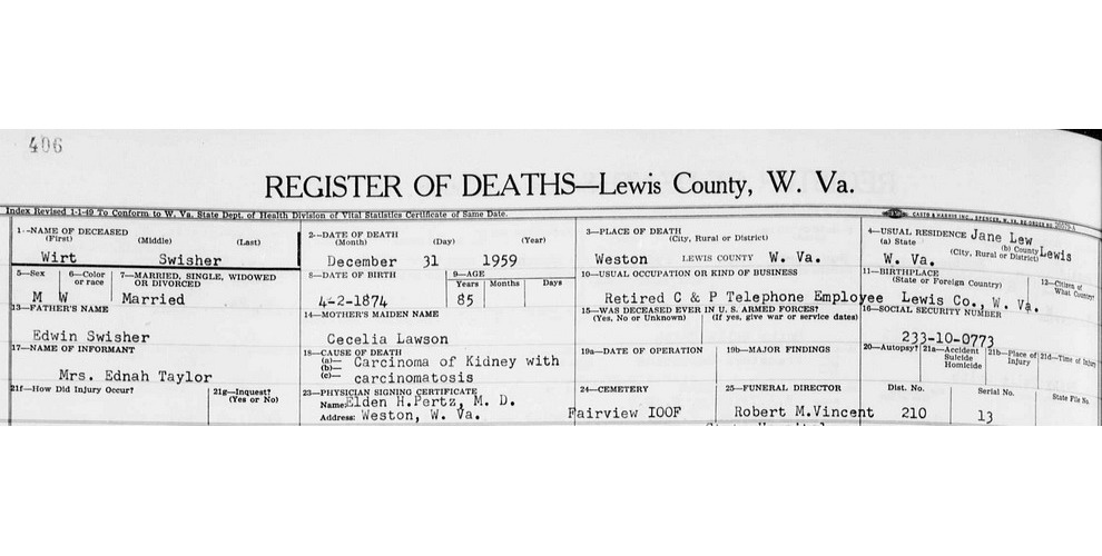 Jul-28-2018Husband: Wirt Swisher Born: Apr- 2-1874 1 Died: Dec-31-1959 in Weston, Lewis Co, WV 1 Buried: in Friendship Cemetery (Fairview IOOF), Berlin Rd (CR 7), Hackers Creek, Lewis Co, WV 1 Resided: in Jane Lew, Lewis Co, WV 2,1 Occupation: Bell Telephone Company 3,1 Father: Edwin Swisher (1848 - 1923) Mother: Cecelia Columbia Lawson (1849 - )