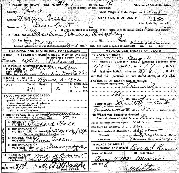 Father: Mother:Wife: Caroline Norris Hall 1,2,3 Married: Apr-25-1865 in Lewis Co, WV 4 Born: Mar- 5-1842 in Lewis Co, (W)VA 5 (see note 1) Died: Aug- 7-1931 in Jane Lew, Lewis Co, WV 5 Buried: in Broad Run Baptist Church Cemetery, Jane Lew, Lewis Co, WV 5 Father: Richard B. Hall Mother: Ann Elizabeth Green