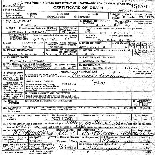 Jul-28-2018Husband: Fay Harrington Underwood Born: Apr-29-1902 in Doddridge Co, WV 1,2,3 Died: Dec-29-1955 in McClellan District, Doddridge Co, WV 1,2 Buried: in Freeman Cemetery, Piggin Run, West Union, Doddridge Co, WV 1,4,5 Resided: in McClellan District, Doddridge Co, WV 1 Resided: 1937 in Goose Creek, Ritchie Co, WV 6 Resided: 1933 in Doddridge Co, WV 3 Census: 1930 in Grant District, Doddridge Co, WV (see note 1) Occupation: farmer and merchant 1 Father: Martin V. Underwood (1859 - 1937) Mother: Amanda E. Gorby (1861 - 1938)