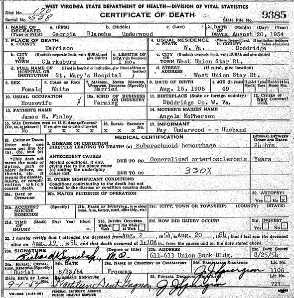 Wife: Georgia Blanche Finley 7,8 Married: May-28-1933 in Morgansville, Doddridge Co, WV 3 Born: Aug-15-1905 in Doddridge Co, WV 1,2 Died: Aug-20-1954 in Clarksburg, Harrison Co, WV 1,2 Buried: in Freeman Cemetery, Piggin Run, West Union, Doddridge Co, WV 1,4,5 Resided: in Doddridge Co, WV 1 Father: James D. Finley (1863 - ) Mother: Angela "Gelia" McPherson (1874 - )