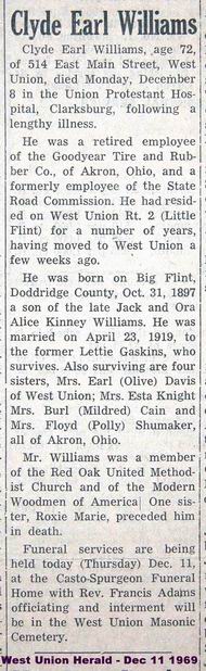 Jul-28-2018Husband: Clyde Earl Williams Also known as: Earl Williams 1 Born: Oct-31-1897 at Big Flint, Doddridge Co, WV 2,3 Died: Dec- 8-1969 in Clarksburg, Harrison Co, WV 4,3 Buried: in Masonic Memorial Park Cemetery, Crystal Lake (West Union), WV 5,2 Resided: in West Union, Doddridge Co, WV 2 Census: 1900, 1920 in Grant District, Doddridge Co, WV Occupation: Goodyear Tire & Rubber of Akron OH (retired), and State Road Commission 2 Father: Lewis Marcus Jackson "Jack" Williams (1873 - 1944) Mother: Ora Alice Kinney (1876 - 1967)