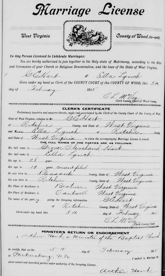 Jul-28-2018Husband: Grover Cleveland Hart Born: Oct-30-1884 in Pleasants Co, WV 1,2,3 Died: Jul- -1977 1 Resided: in Perrysville, Ashland Co, OH 4 Census: 1900, 10, 20, 30, 40 in Murphy District, Ritchie Co, WV Resided: 1915 in Beatrice, Ritchie Co, WV 3 Father: James Coleman Hart (1851 - ) Mother: Sinah A. Miracle (1856 - 1892)