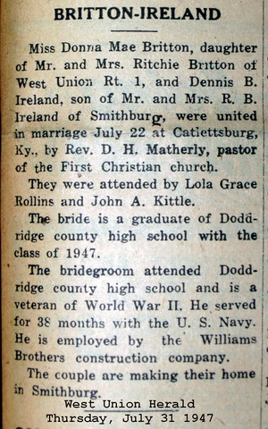 Jul-28-2018Husband: Dennis Brady Ireland Born: Mar-27-1926 in Smithburg, Doddridge Co, WV 1,2,3 Died: Apr- 9-1999 2,3 Buried: in Shadow Lawn Memory Gardens, Newell, Hancock Co, WV 4 Resided: in New Cumberland, Hancock Co, WV 5,6,7 Resided: 1947 in Smithburg, Doddridge Co, WV 8 Census: 1940 in Smithburg, Doddridge Co, WV Census: 1930 in West Union, Doddridge Co, WV Education: Doddridge Co H.S. 8 Military: Nov-11-1943 - Mar-21-1947 US Navy, World War II (amphibious force command ship USS Teton, AGC-14) 9,10,8 Father: Raymond Brady Ireland (1892 - 1949) Mother: Etta Leona Sutton (1894 - 1975)
