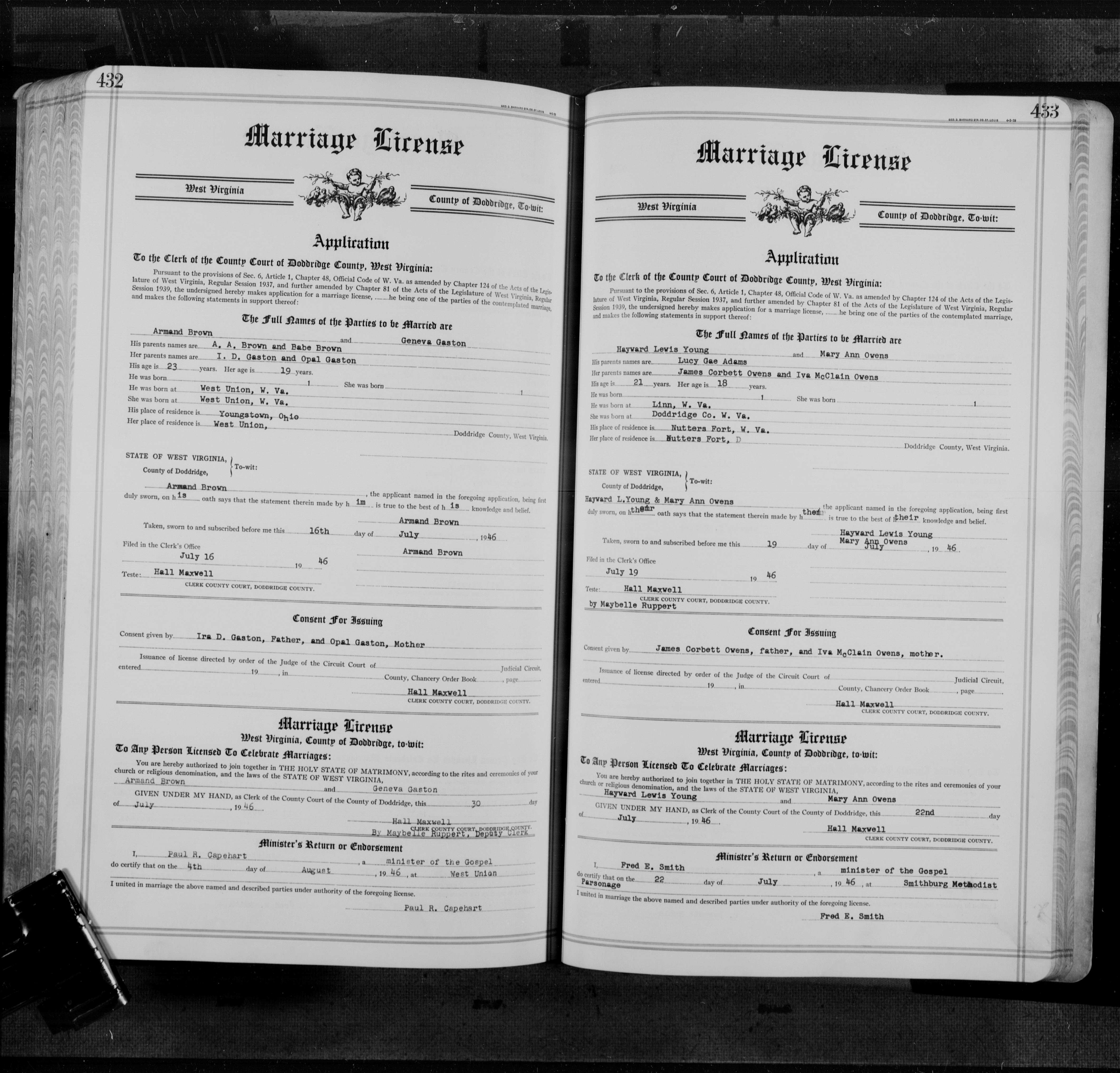 - Graduate of Doddridge County High School (1945) and attended Salem College, Salem, WV, 1945-46. Worked for two years in the office of the Ford garage in West Union. Upon her marriage to Armand Brown in 1946, she moved to Youngstown, Ohio, where Armand's family had moved from West Union while he was overseas during World War II. From 1962 to 1974, she worked as cashier and office worker for A&P food stores in Youngstown and vicinity. In June 1974, with Armand's heart problems preventing him from continuing his job with A&P in Youngstown, they returned to Doddridge County, moving into the house on Oxford Road, at Cabin Run, where Geneva had lived with her family for about five years prior to her marriage. From then until his death in 1985, Armand and Geneva operated what had been her parents' small grocery store adjacent to the family home, changing the name from Gaston's Grocery to Brown's Grocery. With her brother Sam, Geneva was a driving force and principal compiler of this genealogy.